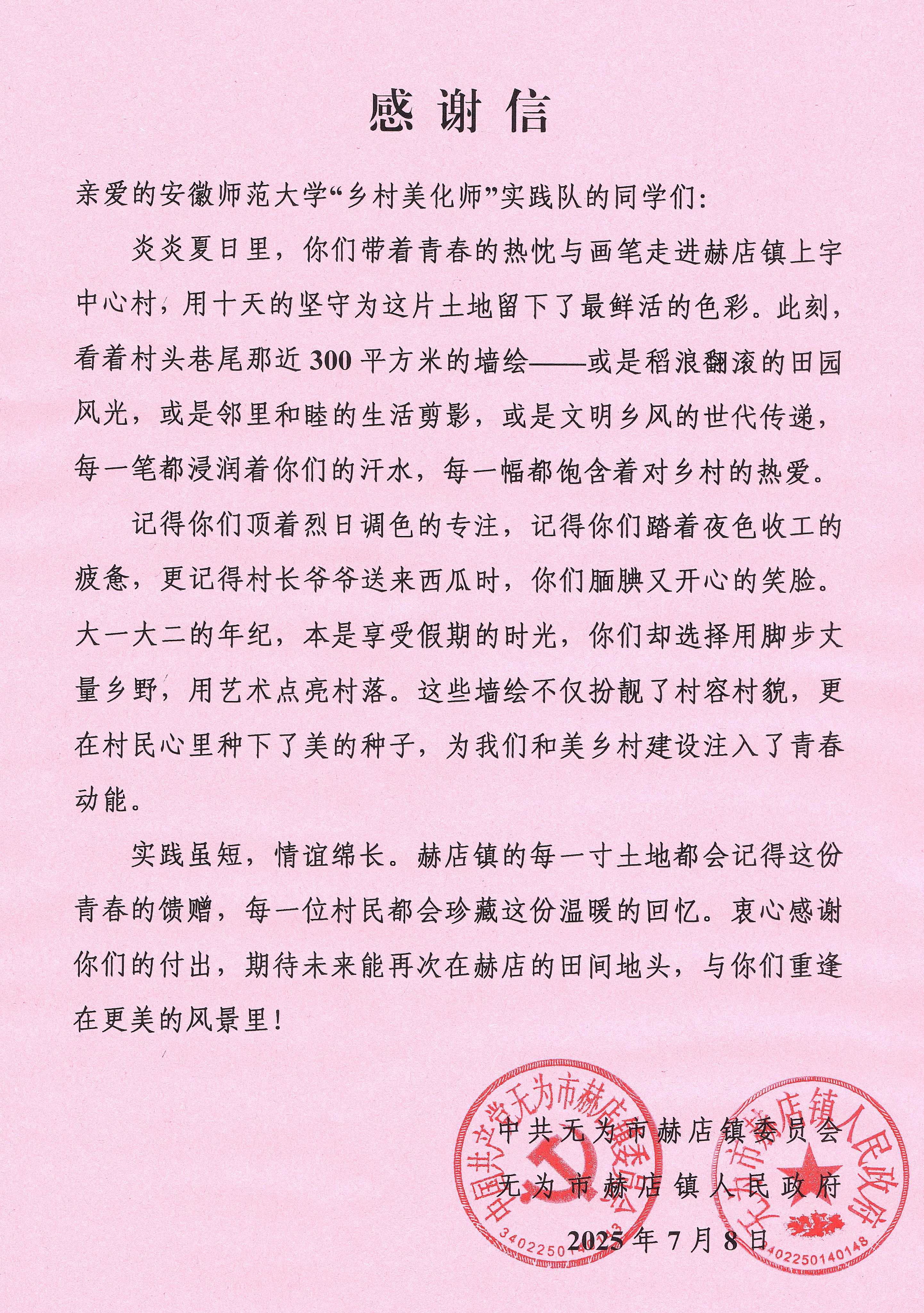 7月8日,中共无为市赫店镇党委、赫店镇人民政府联合向我院“乡村美化师”暑期社会实践队发来感谢信,以质朴文字致敬19名师生十余天扎根上宇中心村,创作近300平方米墙绘的青春担当,点赞这支以大一大二学生为主的团队“用艺术点亮乡野,为和美乡村注入动能”。