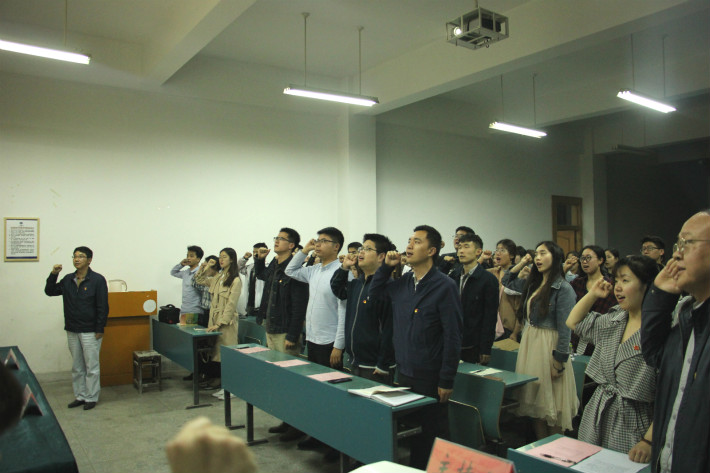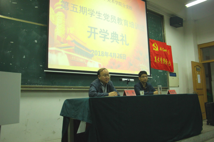 随后,本期培训班班主任窦雪介绍本期学生党员培训班基本情况并宣读了班级管理制度,提醒同学们严格遵守纪律,安排好自己的学习与生活。典礼上,2015级国画专业同学付鑫飞代表班级同学发言表示将珍惜此次学习机会,严格要求自己,提高思想觉悟,争做合格党员,并带领全体学员在党旗下庄严宣誓,重温入党誓词。张韬在总结讲话中指出本院党支部个别党员存在的问题,希望广大学员引以为戒,典礼结束后,王继民以《学懂 弄通 做实——十九大精神解读》为题为本次党课班开讲。