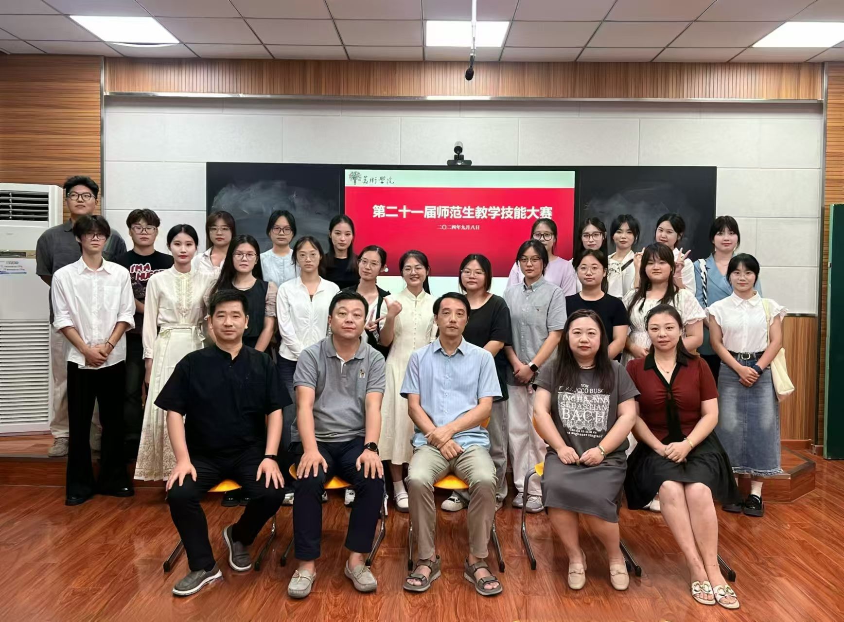本次决赛邀请了芜湖市美术教研员张颖以及中学名师李骑、杨静和杨惠群等四位老师担任评委。大赛面向美术学专业2021级、2022级本科生,其中,2022级全员参加,2023级学生参加了观摩。比赛以有生上课的形式展示了师范生的基本教学能力,分为年级初赛、学院决赛两个阶段。在9月6日晚的年级初赛中,由我院位师范生教学技能指导教师和芜湖市荟萃中学张金广等7位一线名师共同担任评委,通过公开选拔,22位同学进入本次决赛。
