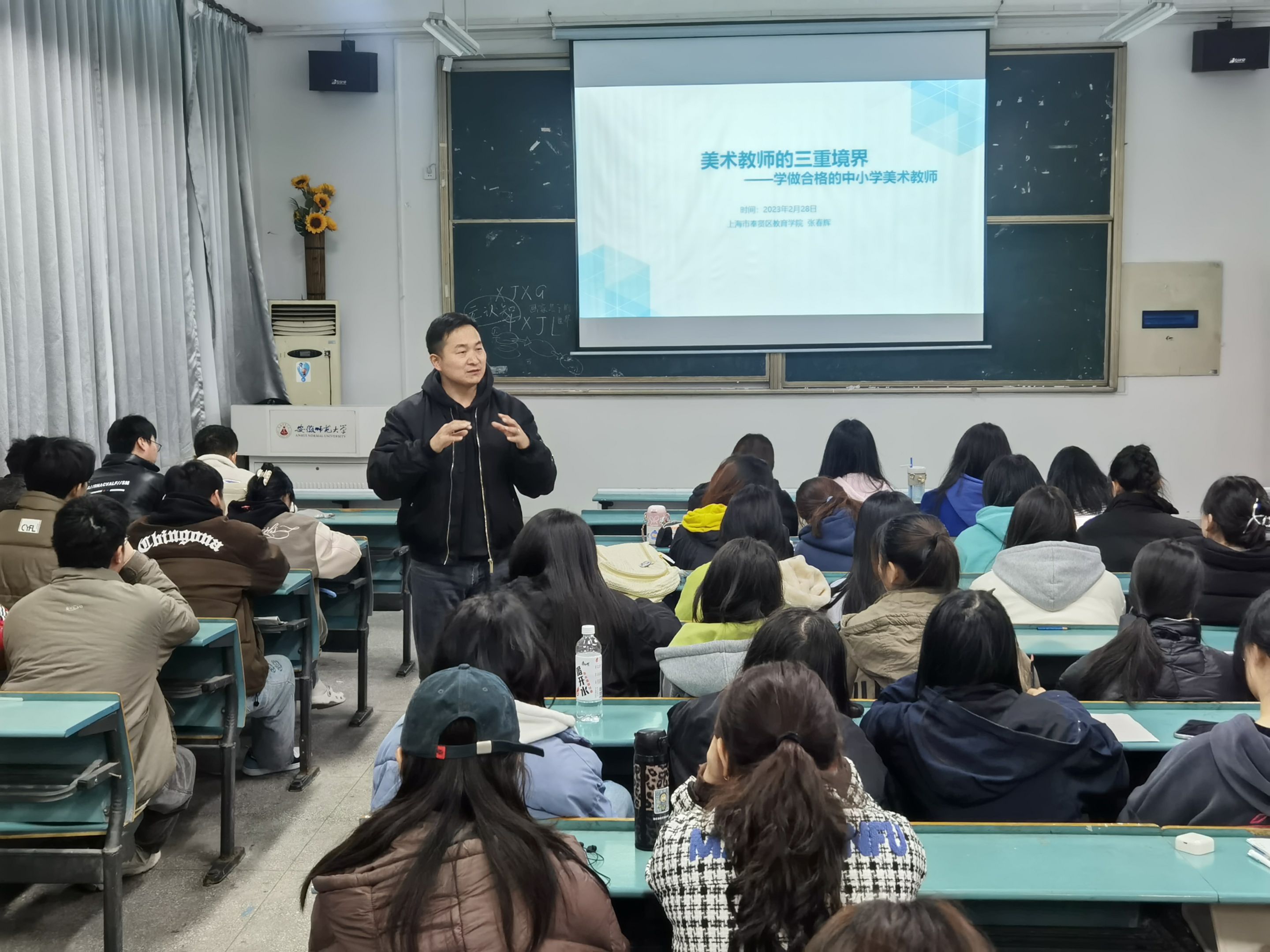教育实习是师范生培养中重要的实践性教学环节。2月28日,美术学专业邀请上海市奉贤区中学美术教研员、bwin必赢线路检测教育硕士实践导师张春辉高级教师为2020级学生开展题为《美术教师的三重境界——学做合格的中学美术教师》的教育实习主题讲座。讲座活动由朱德义教授主持,2020级全体师范生和2021级、2022级部分师范生同学参加。