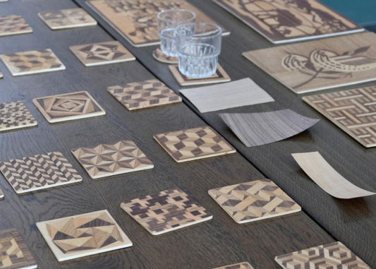 课程共分为两个模块。一是薄木镶嵌工艺,学生将不同质地与颜色的薄木料嵌入木中,组成各种图案,并将其与杯垫产品做结合,感受木材的天然美感和材料特性。在体验该工艺的同时,有助于学生对木材进行多思维、多视角的设计探索,丰富并提高其设计语言。
