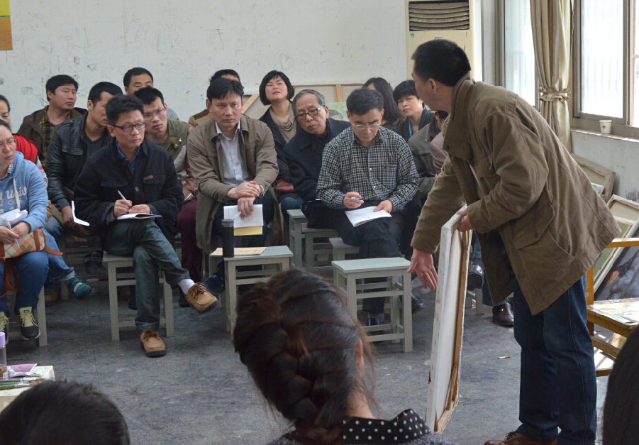 本次观摩课的教学内容是“油画半身像写生”。周群老师从中西方油画大师的经典作品切入,紧密结合教学内容和学生的学习实际,从油画半身像写生的整体构图、形体塑造、色彩处理、形式节奏以及画面经营表现等各方面,为同学们深入讲解了油画半身像写生的重点与难点,详细分析了同学们在油画半身像写生过程中容易出现的主要问题及解决方法,要求学生培育正确的观察方法,并强化对人物形象的敏锐感受,提高审美情趣和修养。周群老师还强调,学生作画时必须加强对绘画基本功和基本规律的把握,并学会独立思考,努力对画面进行独特表现,创作出富有个人面貌的作品。整节课内容详实,表述流畅自然,课堂气氛活跃,且具有独特的教学理念和一定的学术延伸。