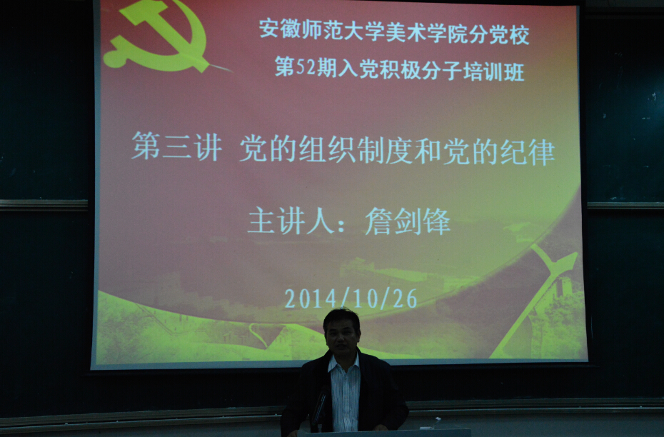 10月26日上午,437ccm必赢国际版分党校第52期入党积极分子培训班在学院A103教室开展第三次授课。校党委宣传部副部长詹剑锋应邀为入党积极分子培训班学员讲授了《党的组织制度与纪律》,分党校班主任盛贤和89位培训班学员认真聆听了詹部长的讲课。