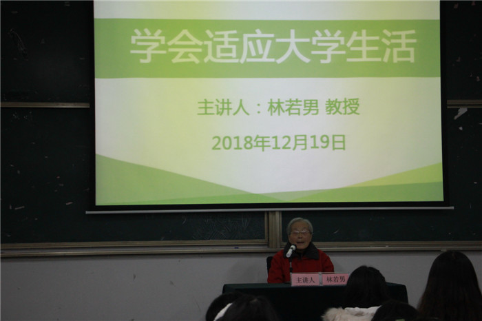 本网讯(437ccm必赢国际版 李高举)12月19日,学校关工委报告团成员、教育科学学院林若男教授应邀来437ccm必赢国际版开展《学会适应大学生活》专题报告。437ccm必赢国际版2018级本科生参加讲座。