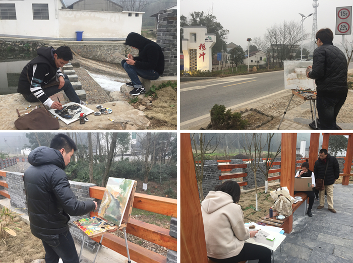 活动现场,同学们迅速进入作画状态,挥舞着画笔,根据自身特长分别用素描、速写、水彩、油画、国画等方式对繁昌县梅冲村美丽的风景进行绘制。天气有些寒冷,但丝毫没有影响学生们的艺术创作热情,纸上跳跃的画笔勾勒出梅冲的美景,展现了梅冲的自然风光和人文风貌。