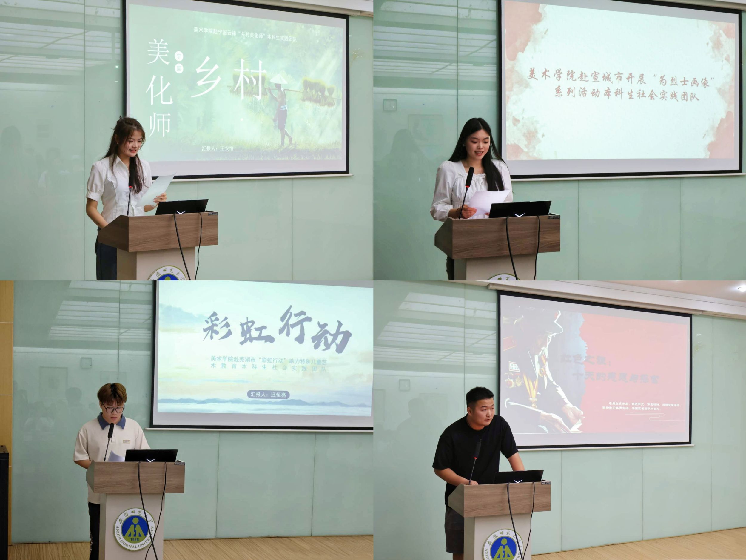 答辩会上,各团队围绕“乡村美化师”“为烈士画像”“美育聚梦云课堂”“彩虹行动”等主题,从实践背景、实践形式、成员分工、预期成果等方面进行展示和讲解,各评委老师提出问题,团队负责人进行了解答,答辩围绕团队立项意义、艺术实践途径以及后勤安全保障等内容,突出创新意识,强化专业融合。