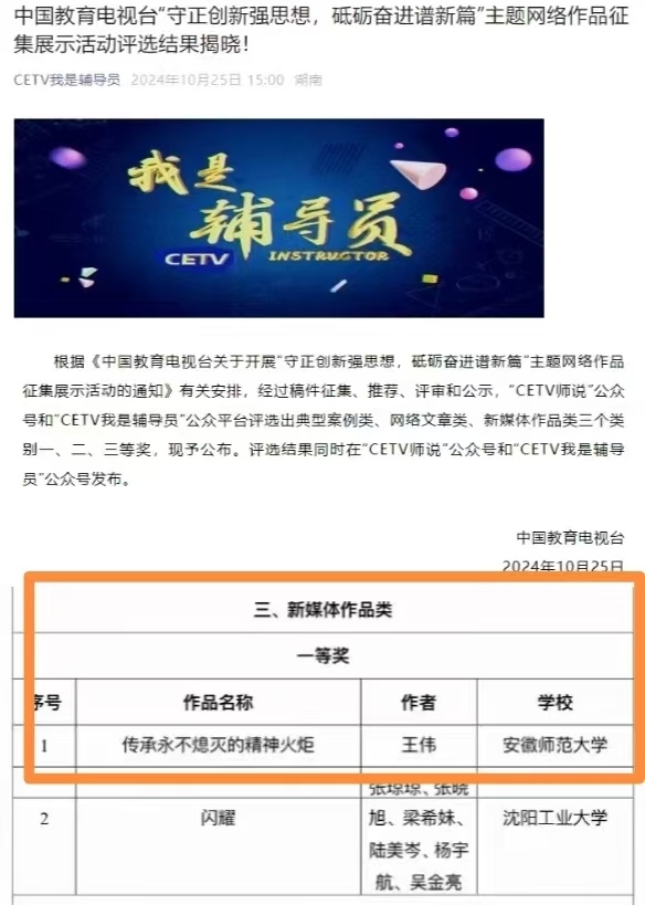 自征集活动开展以来,437ccm必赢国际版党委高度重视,认真部署,积极动员各党支部广泛参与。通过“小切口”引出“大主题”,由“小故事”讲明“大道理”,精心策划微党课主题,反复打磨作品,让党的创新理论更好地“飞入寻常百姓家”。微党课《传承永不熄灭的精神火炬》以“红色青春守护人”工作室开展的系列活动为切入点,以身边的榜样为引领,讲述了400余名师生接力参与为烈士画像、绘制英雄事迹绘本、投身烈士家乡乡村振兴工作的优秀事迹,事迹荣获全国学雷锋志愿服务“四个100”先进典型、中国青年志愿服务项目大赛金奖,被央视新闻、CCTV1、CCTV3、CCTV7、人民日报、新华社、解放军报等国家级媒体宣传报道300余次。在此次中国教育电视台组织开展的“守正创新强思想,砥砺奋进谱新篇”主题网络作品征集展示活动中,《传承永不熄灭的精神火炬》荣获新媒体类作品一等奖。该微党课也作为优质微党课在学校发展对象培训班、党员教育培训班等培训中多次进行展播。