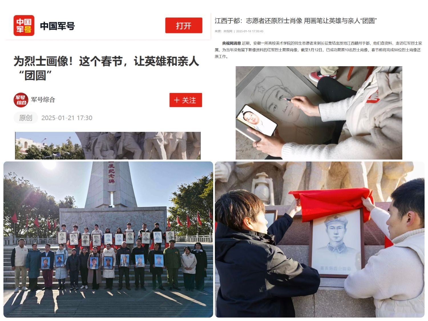 “红色青春守护人”团队志愿者们赴江西于都革命老区开展“为烈士画像”公益实践活动,他们查资料、走访红军烈士家属,为当年没有留下影像资料的红军烈士复原肖像,在这个春节,志愿者们用画笔让英雄和家人“团圆”。CCTV7、新华社、中国青年报、中国军号等多家媒体报道,全网获得关注量超100W,点赞超1w,转发评论超5000,引发广大师生和社会关注。
