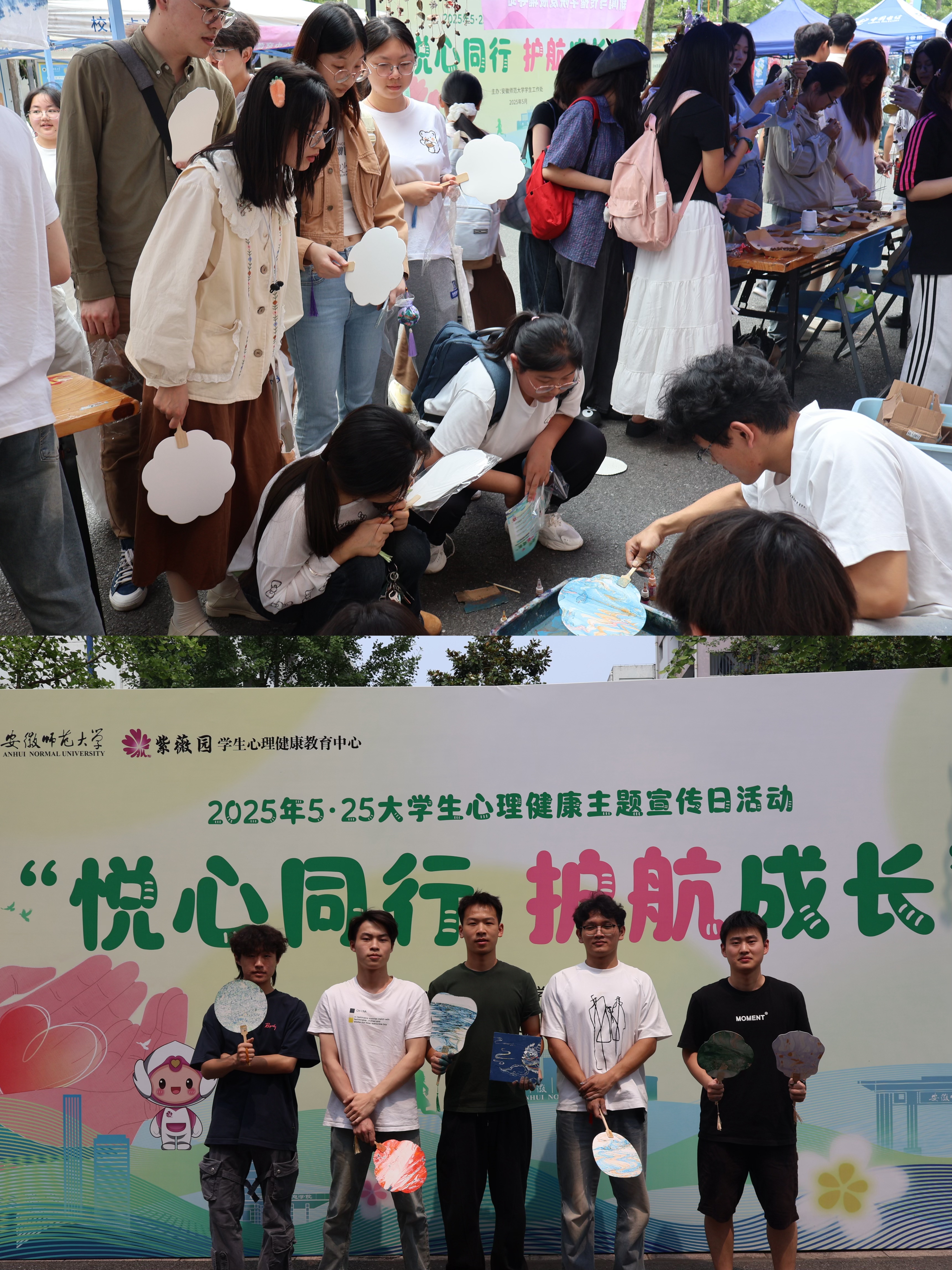 结合专业特色,搭建沟通桥梁。学院充分发挥专业优势,在5·25心理健康月活动现场进行优秀作品展示,现场还组织扎染、漆扇、扭扭棒创作等体验活动,吸引较多学生排队参与。